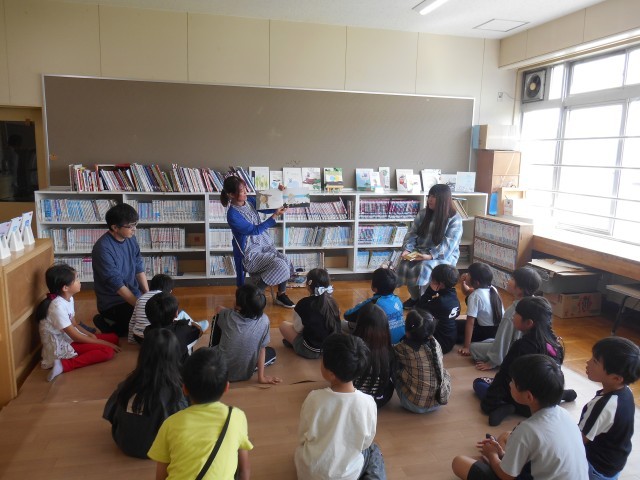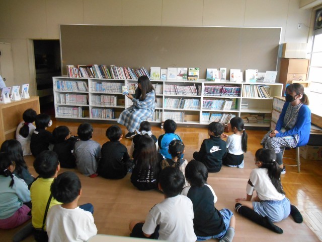 主に低学年の児童が集まり、楽しみながら聞いている様子です。📖