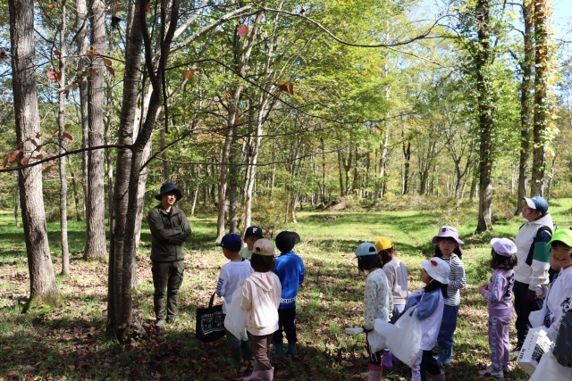 生活科の学習で1・2年生が木育の森(旭町生活環境保全林「みどりの郷」)に行ってきました。芦別市林務係の方に教えてもらいながら、秋の山を散策し、落ち葉や木の実などを拾ってきました。