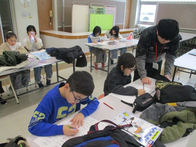 昨日で後期前半が終了し、今日から冬休みが始まりました。学校では「冬休みチャレンジ教室」が行われ、視聴覚室と大多目的室に分かれて活動しました。今回も中学生と高校生のボランティアのみなさんに教えてもらいながら、冬休みの課題などに取り組みました。